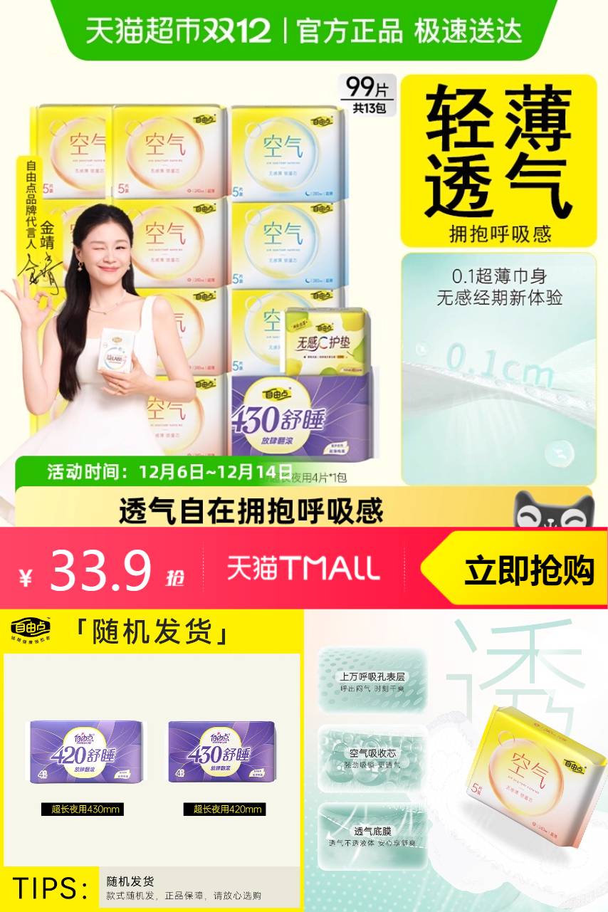 【淘金币抵扣3.1,猫超价到礼金1.35,88VIP专享95折减1.7,消费券后24.25】经典款空气卫生巾,日用8包+夜用3包+加长夜用1包+护垫1包,日夜用组合装99片!守护经期,安睡一整晚!