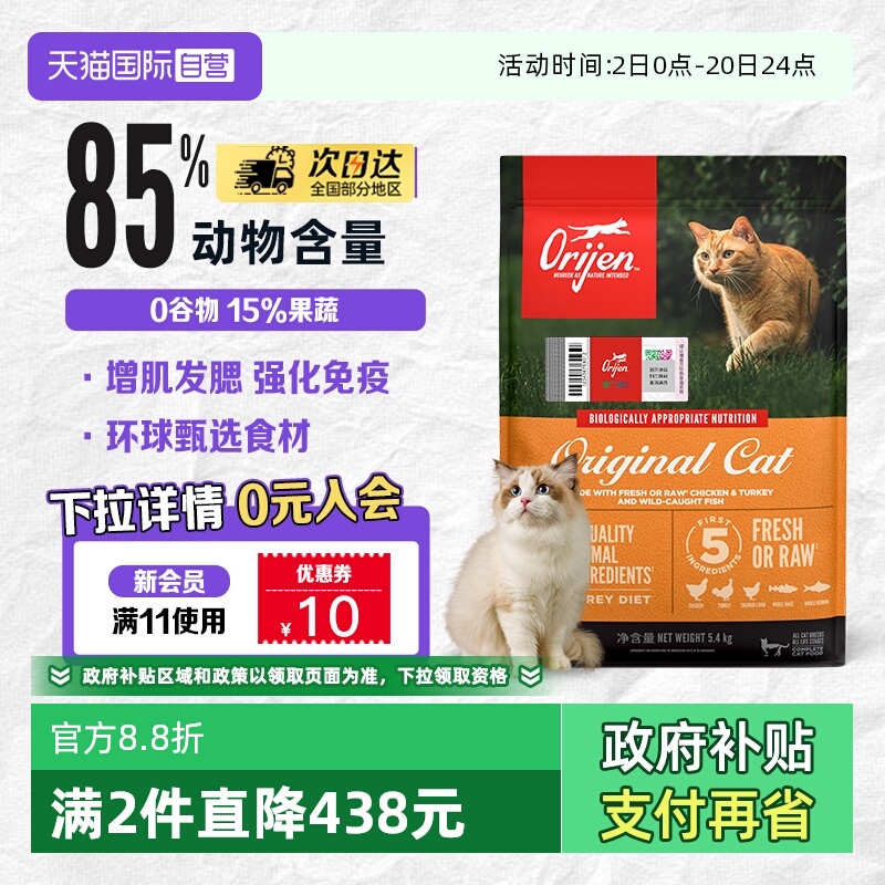 【限时促销】Orijen/渴望全阶段原味鸡肉猫粮,选用优质鸡肉为原料,营养丰富均衡,适合不同年龄段猫咪食用。现在购买还可享受优惠哦!