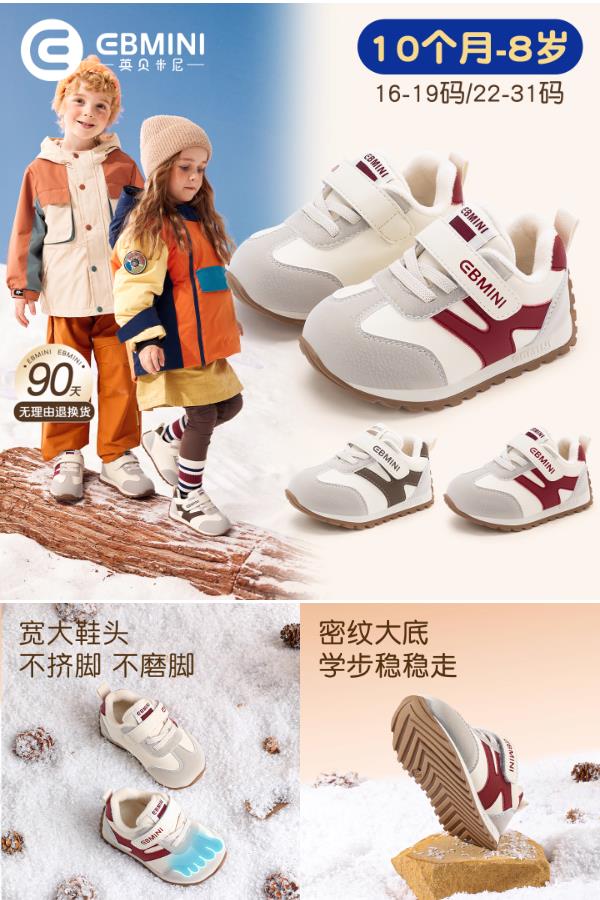英贝米尼学步鞋专为0-3岁宝宝设计,加绒保暖+防滑软底+科学足弓支撑,159.9元享高端婴童品牌品质,加厚云朵棉、透气内里、可调节魔术贴,性价比之选!给宝宝一双会呼吸的暖萌小靴子~