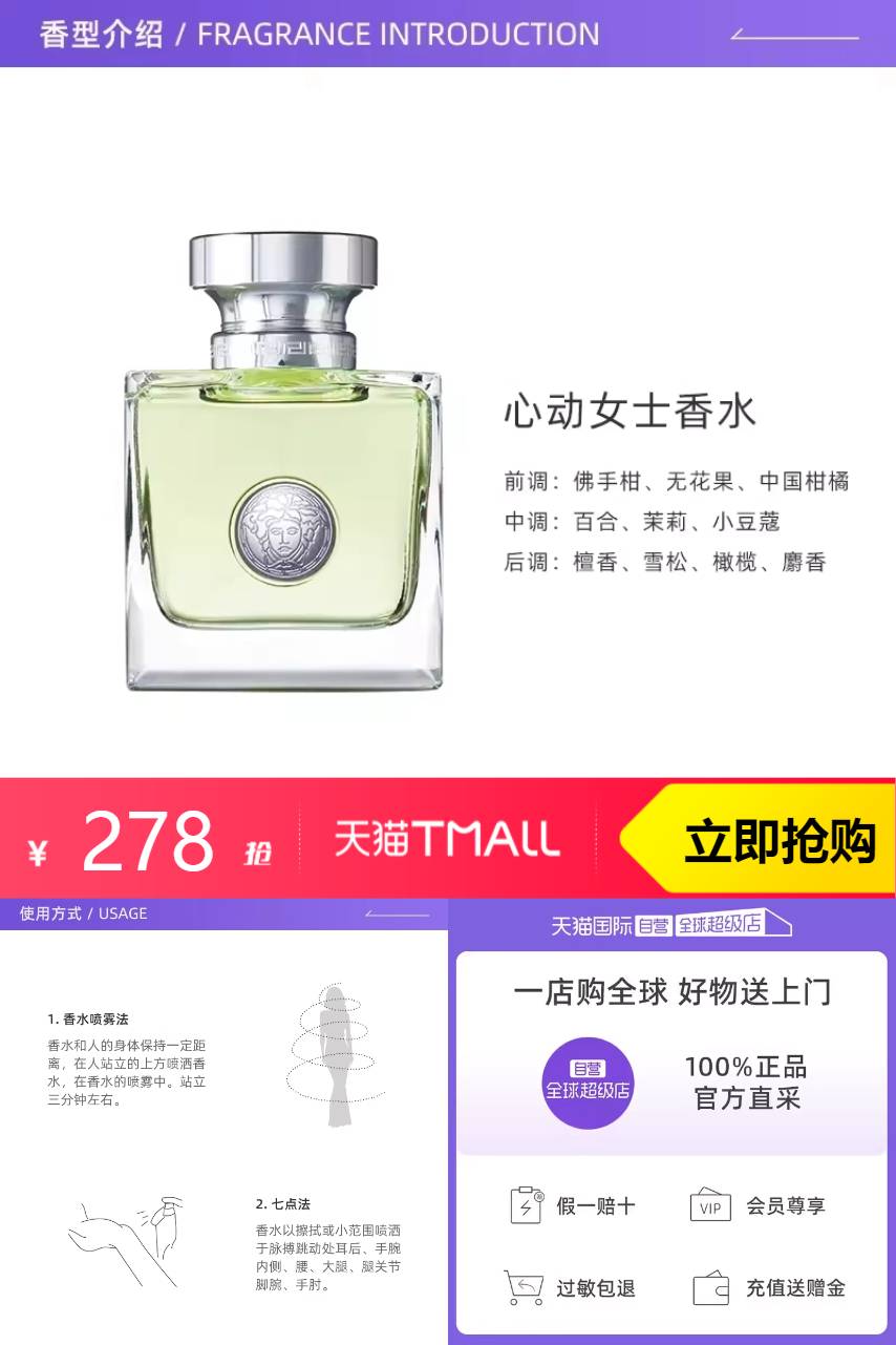 【淘金币减9.84,消费券减25,88vip到手229】范思哲心动女士地中海花香调香水50mL,充满活力的佛手柑和绿色柑橘带来自然 而清新的香气,闪亮而充满活力的感觉;鲜 明的中调为纯净的花香,娇贵纯净的百合花 与清新、辛辣浓烈的小豆蔻绝妙组合,茉莉 花的芬芳萦绕强烈气息。