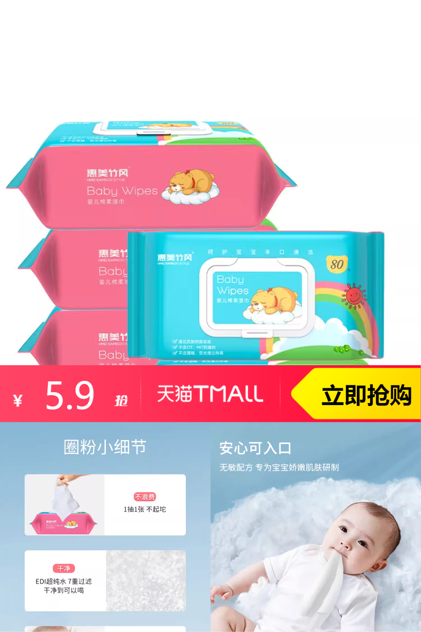 惠美竹风婴儿母婴湿巾100抽 7元减2 商品纠错