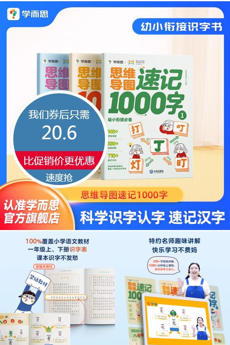 【淘金币抵扣更优惠】学而思思维导图速记汉字1000字,紧贴教材,轻松入学,特约名师趣味讲解,科学识字认字,速记汉字,四类模板,识字手抄报不发愁!快乐学习不费妈!