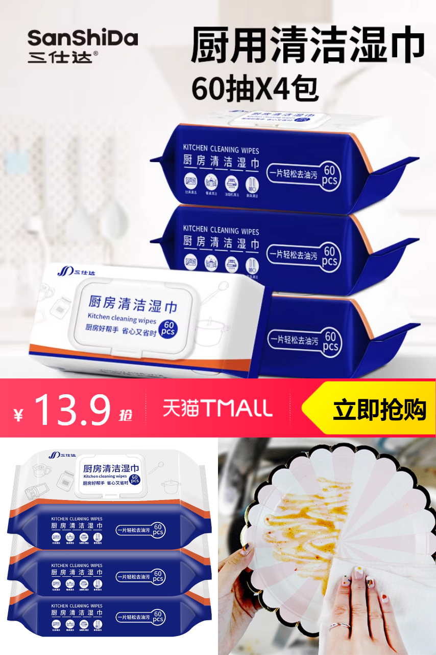 推荐:三仕达厨房湿巾强力去油污专用湿巾4包
