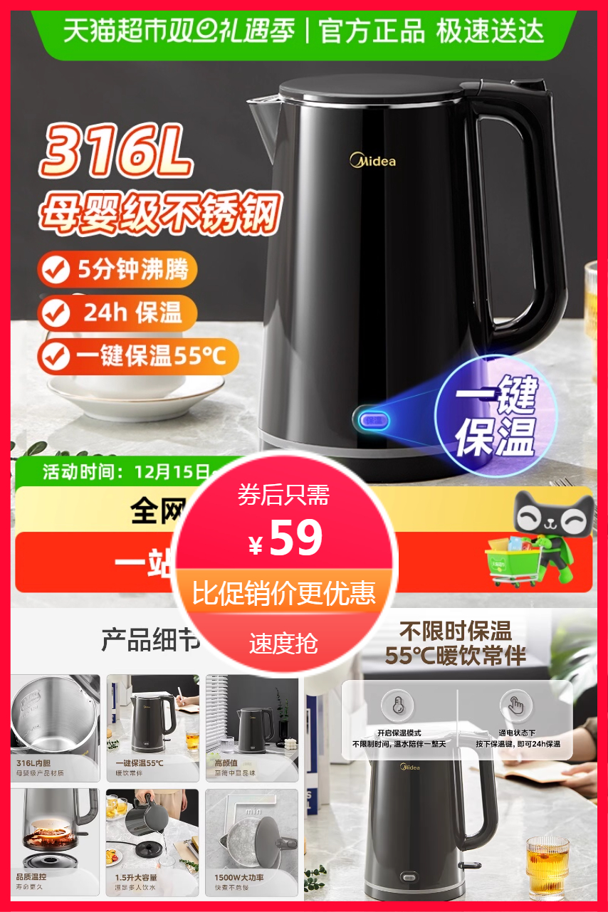 美的电热水壶恒温保温!304不锈钢内胆,双层防烫设计,烧水快又安全~一键恒温不反复烧开,节能省电,家用更安心~