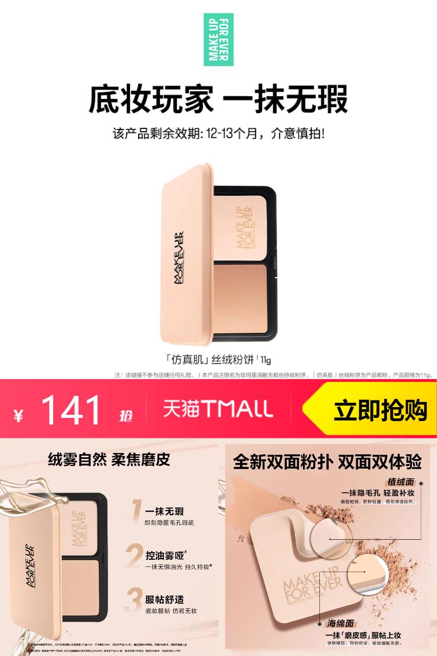 【3折清仓款,效期还有一年-13个月】丝绒肌如丝般顺滑,遮瑕力超强,持久不脱妆,玫珂菲粉饼,仿真肌肤感!