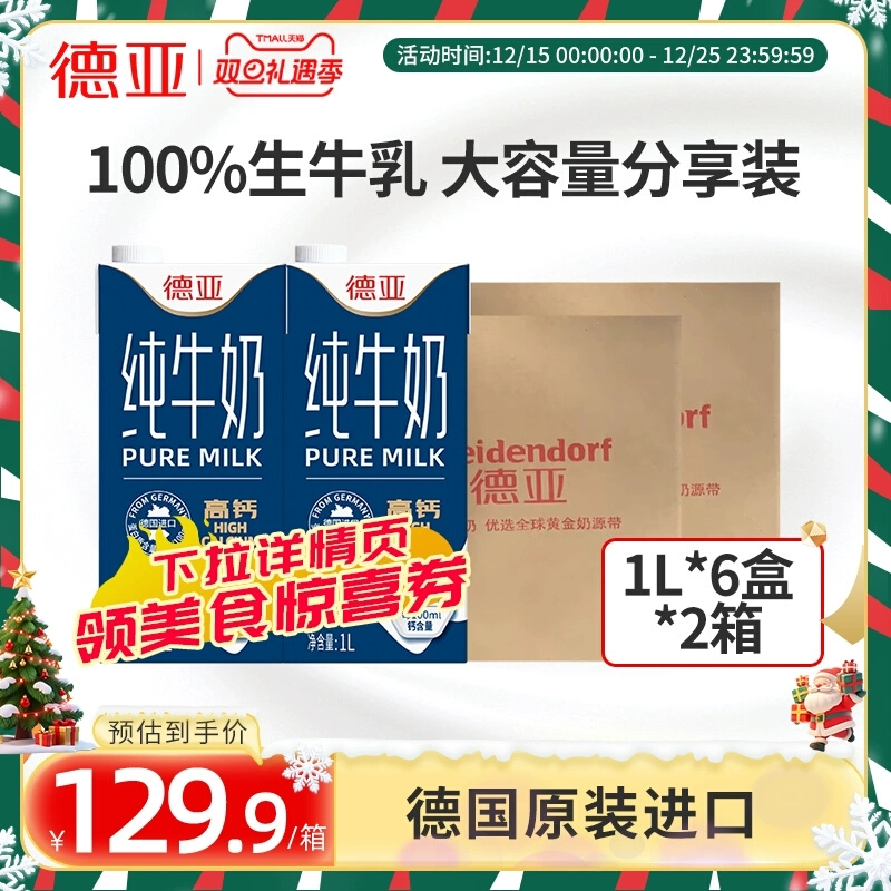 【淘金币12,美食惊喜200-16,叠88VIP双旦消费券200-25,到手85.05】德亚原装进口纯牛奶全脂高钙1L*12盒,奶香清甜更轻负担,钙力满满~