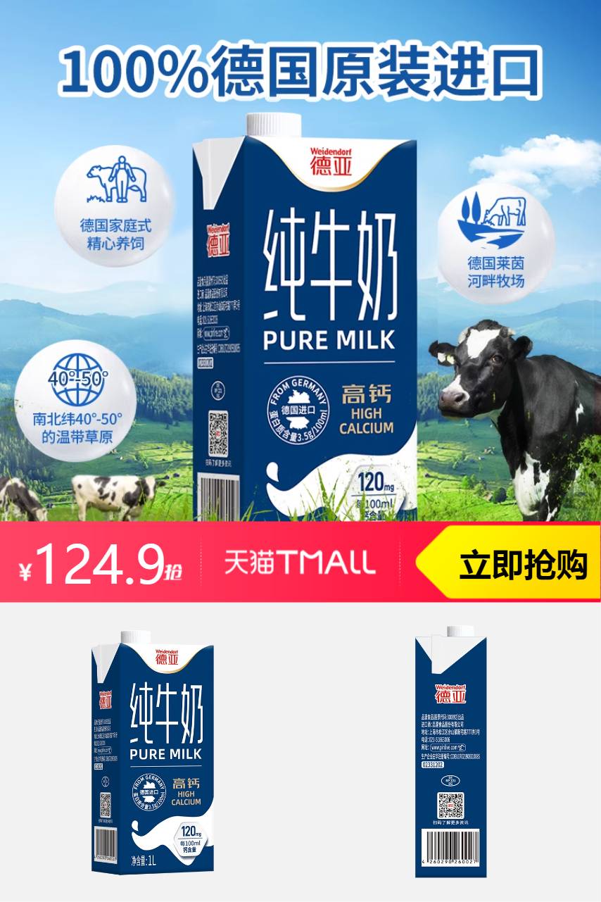 德亚 德亚原装进口纯牛奶全脂高钙1L*12盒 200元减75.1 商品纠错