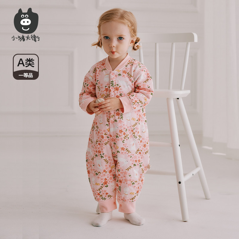 小猪大卫新生儿秋冬夹棉连体衣男女宝宝卡通印花中开保暖爬服