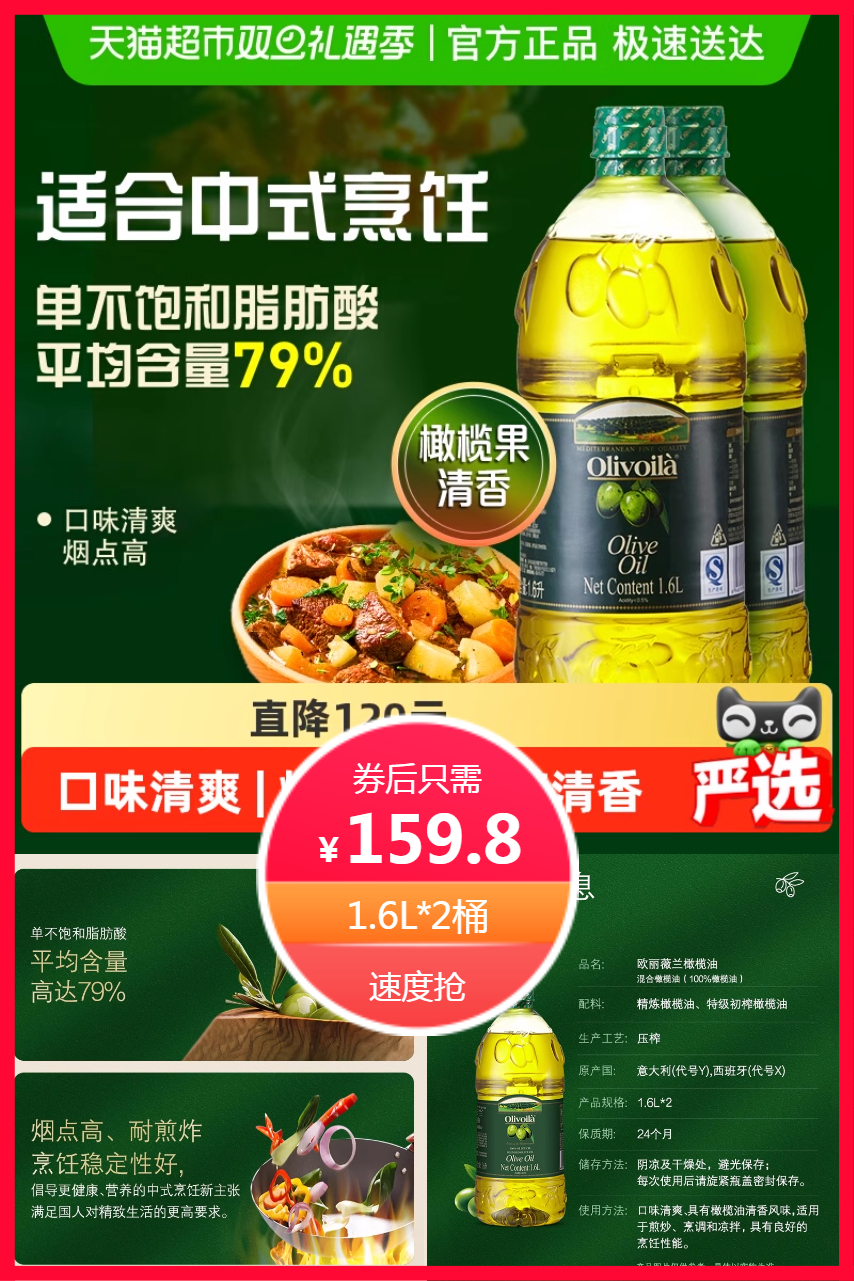 官方立减120+淘金币6+88vip7.99元+40优惠券,到手约145元,折/桶约72元,欧丽薇兰纯正橄榄油,油烟少,口感清淡不油腻,营养均衡,满足家庭所需