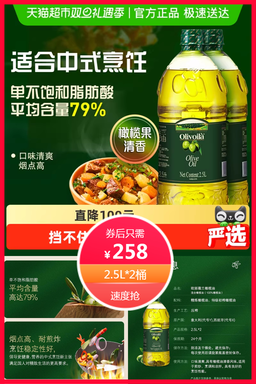 立减100+超市补贴9+淘金币11.94元,到手约237元,折/桶118.5元,欧丽薇兰纯正橄榄油,油烟少,口感清淡不油腻,营养均衡,满足家庭所需