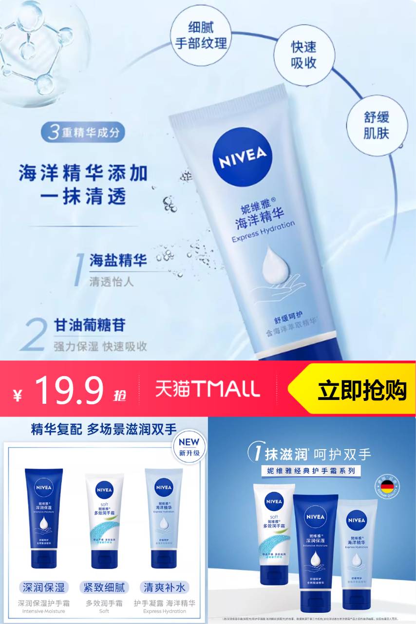 【淘金币1.19,88VIP到手17.7元,赠洁面30g*2,折合4.4元/件】妮维雅海洋精华护手50g*2,一抹滋润,呵护双手。