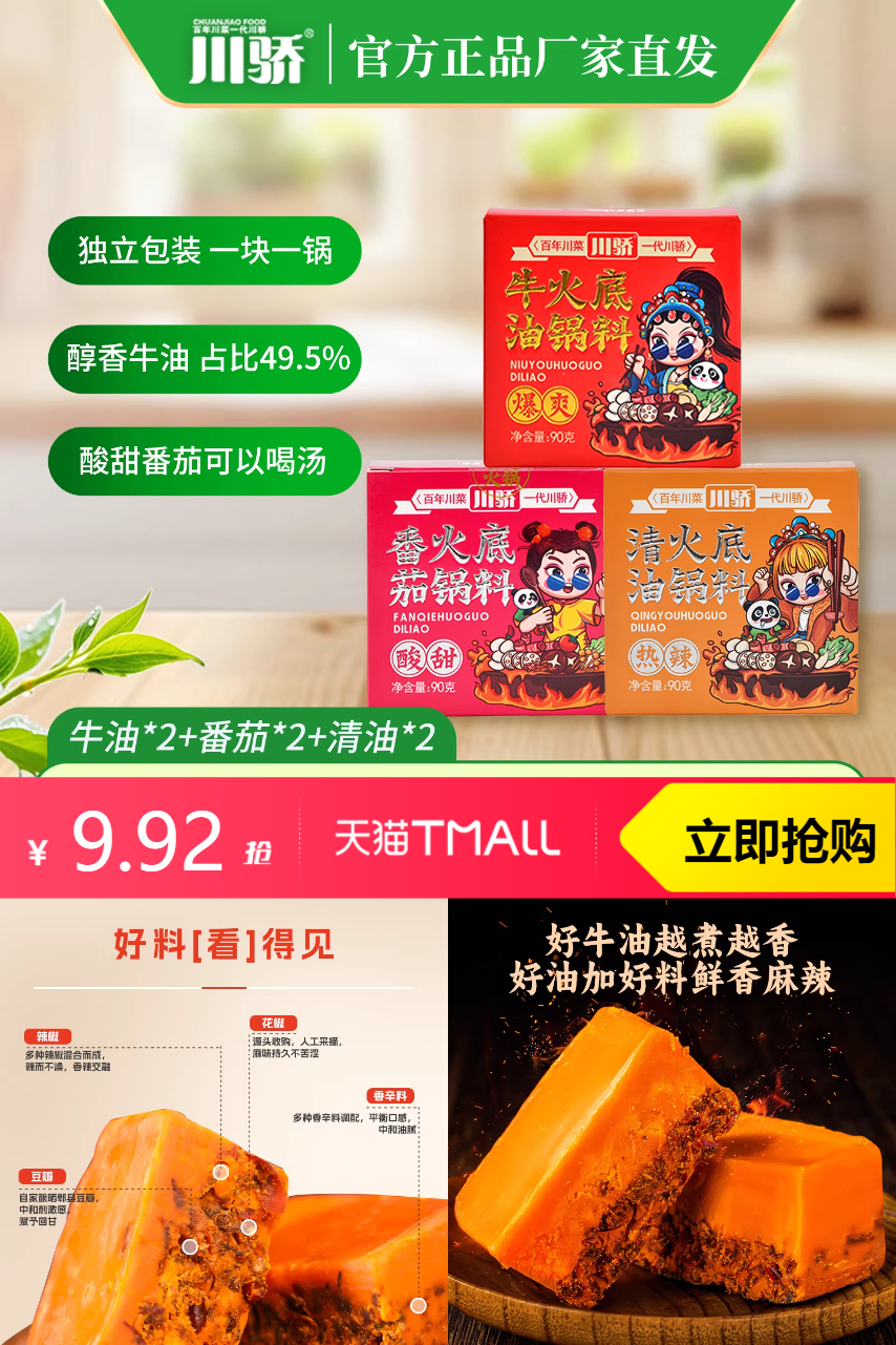 【淘金币抵扣1.37,到手8.55】 他家可是成都非物质文化遗产!不在成都也能吃到地道成都火锅! 有牛油/清油/番茄三种口味!酸甜麻辣都有!可炒菜,香锅,炖肉咋吃咋香!