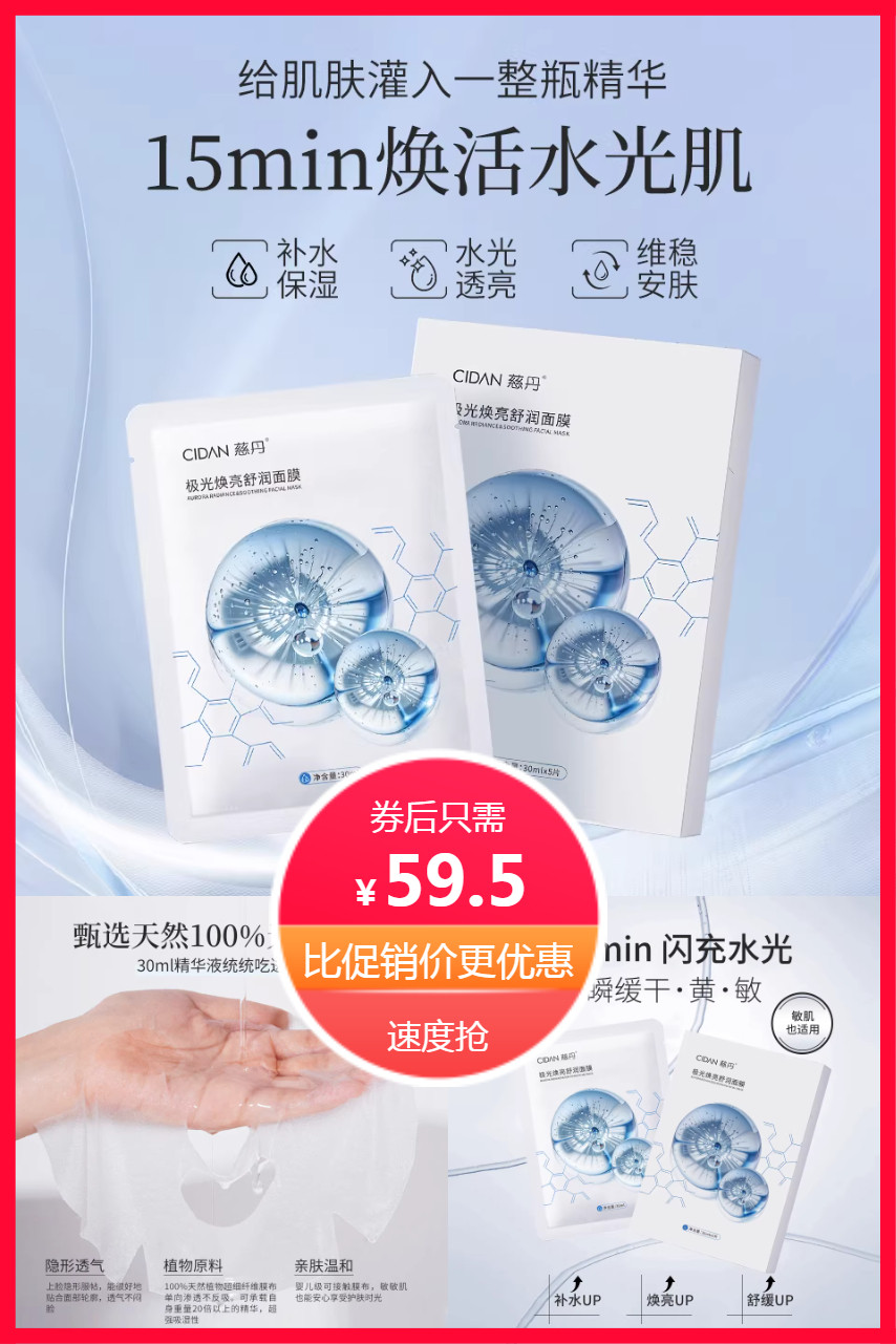 【赠运费险】慈丹极光焕亮面膜!含多重植物精粹+透明质酸,5片装密集补水、舒缓维稳,敷出水光透亮肌~媲美院线护理的高性价比水光膜,敏感肌也安心用~