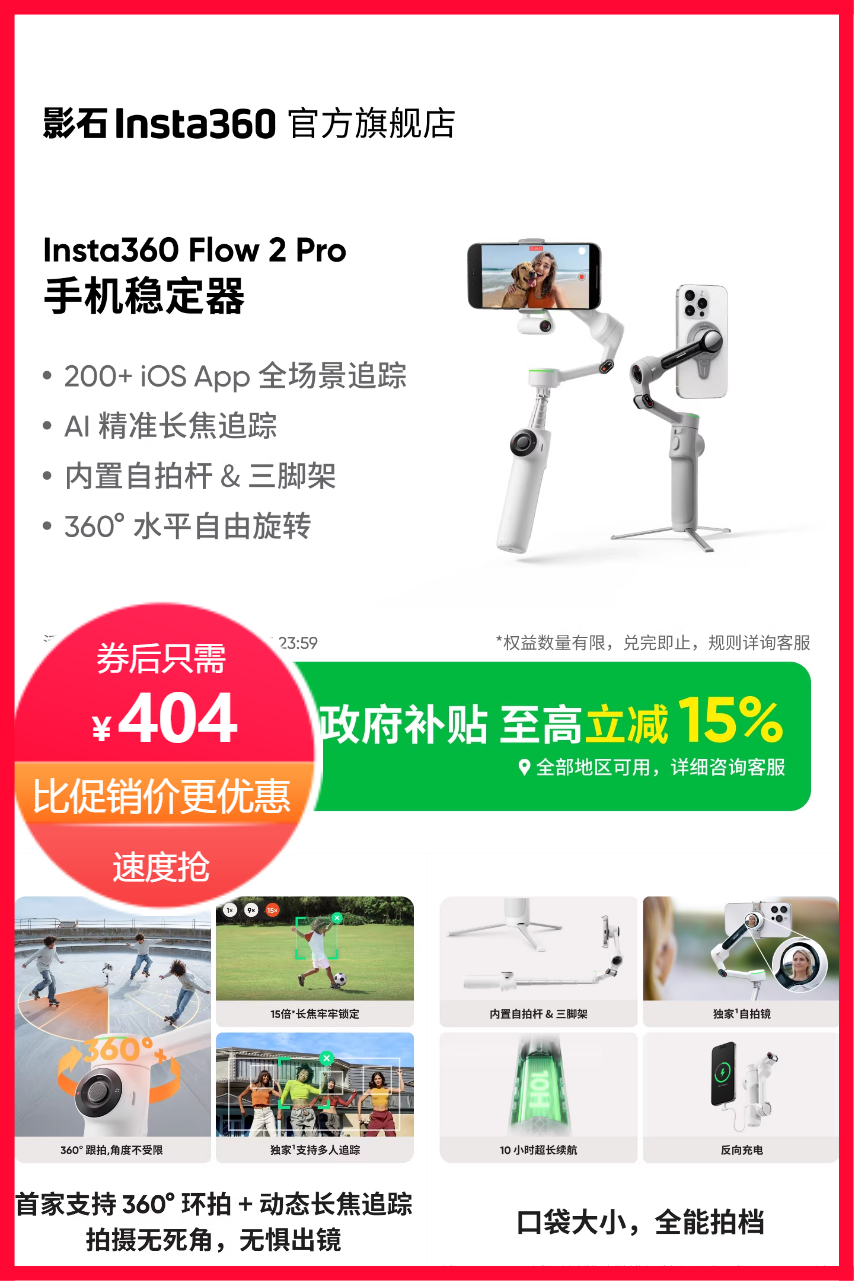 影石Insta360Flow2Pro手机稳定器手持云台三轴增稳ai追踪防抖视频直播便携三脚架自拍杆补光灯。首家支持360°环拍+动态长焦追踪,拍摄无死角,无惧出镜!