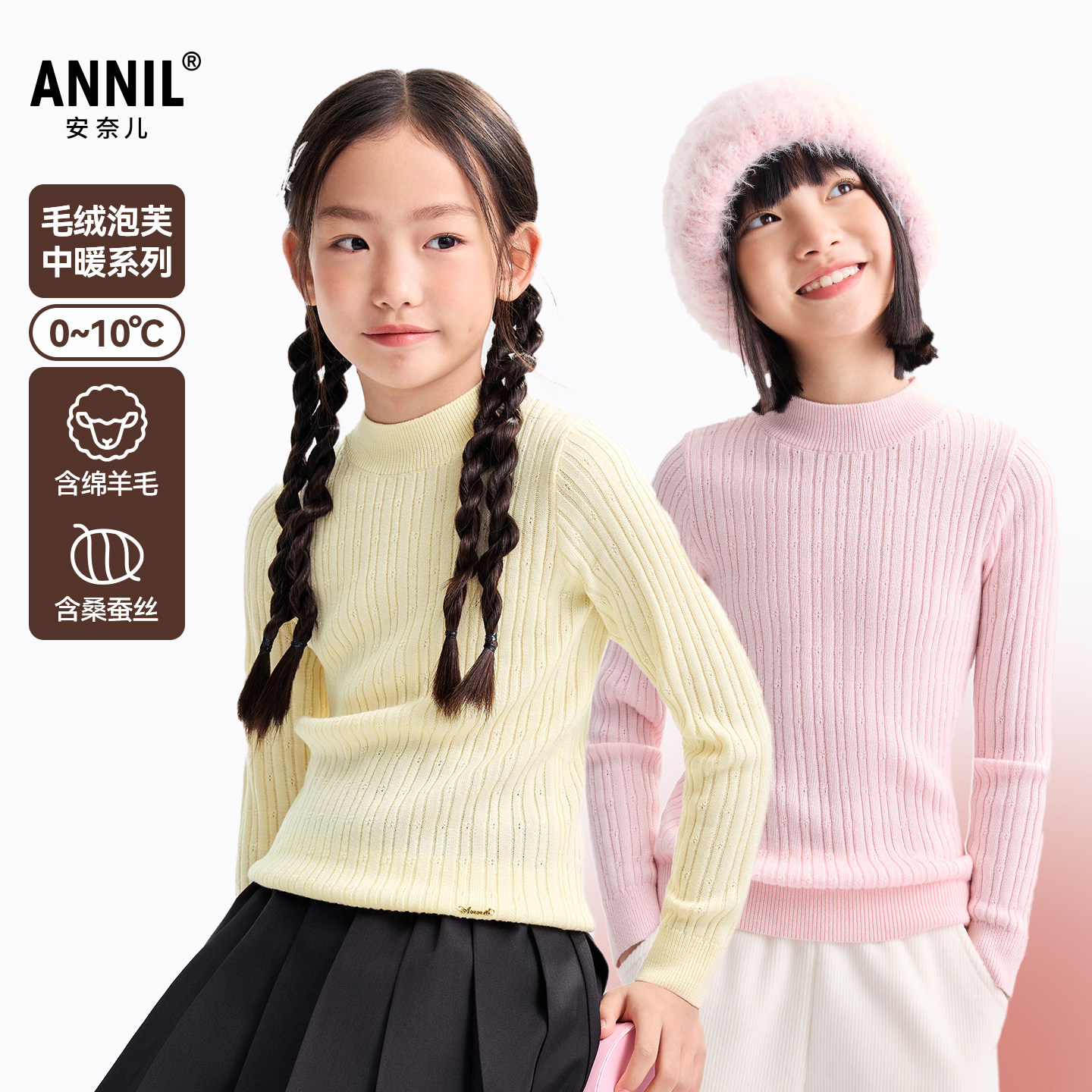 推荐:【含蚕丝羊毛】安奈儿童装女童中领长袖毛衣针织衫2025冬保暖蓄热