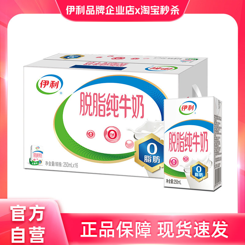 推荐:官方自营】伊利脱脂纯牛奶250ml*16盒学生营养早餐【25年9月