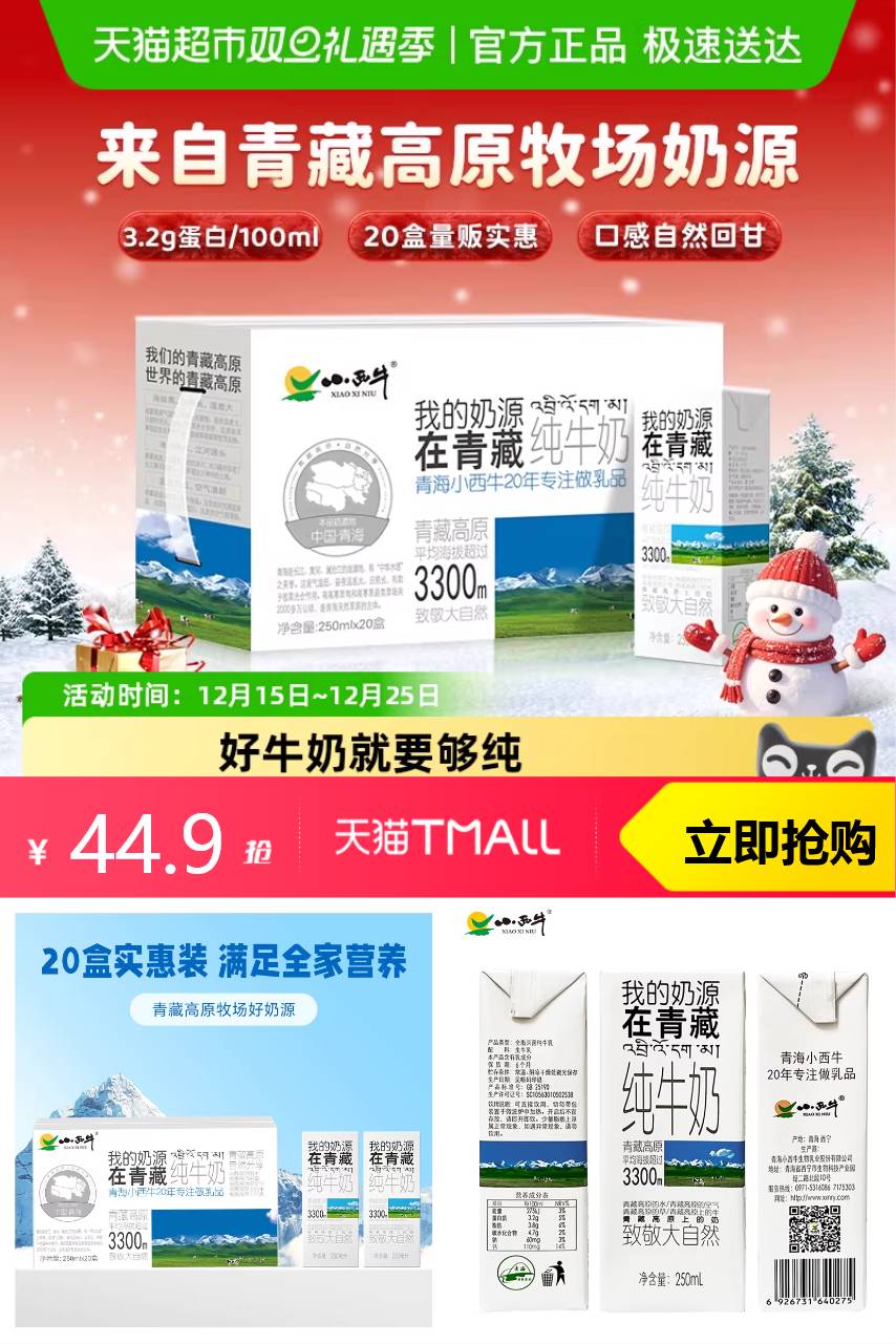 【88vip减2.25元,淘金币减3.61元,到手价39.04元。叠超市券满59减6元,到手价33.91元。】海拔3300m青藏高原牧场,每100ml含110mg原生钙/3.2g乳蛋白,自然不腥不腻,配料表只有生牛乳,孩子放心喝!