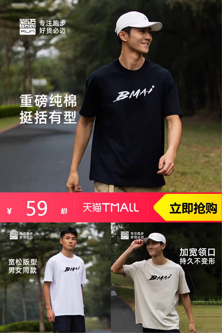 ⭕必迈夏季纯棉短袖男跑步文化短袖宽松T恤