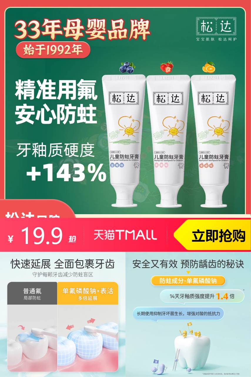 【拍4支装,原价79.9-60元券=到手19.9】松达宝宝牙膏,怕锯齿用单氟磷酸钠,精研新配方,防蛀全升级。