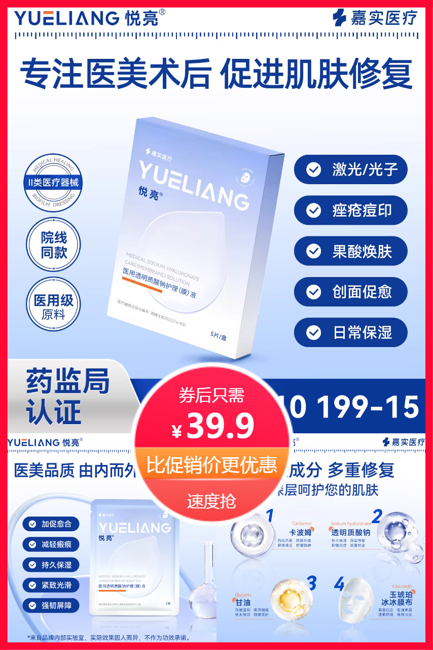 悦亮械字号透明质酸钠敷料!国家药监局认证,专为微创术后、痤疮炎症期设计,舒缓修护更安心~温和配方,无酒精无香精,敏感肌&医美术后人群安心首选!
