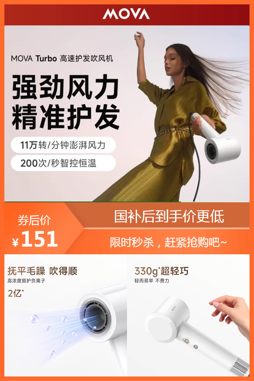 国补15%补贴后128.35元,高效速干大风速,智控恒温监测,超静降噪设计,8种护发模式,解决干枯毛躁问题,出差旅行,330g轻巧设计,运动健身轻松携带。