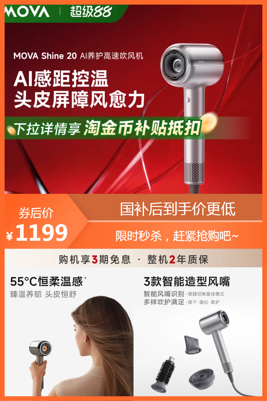 国补15%补贴后1019.15元,88vip可再享95折减59.95元,到手968.19元,多款智能造型风嘴,实时感应出风口与头皮的吹护距离,并动态调温,稳定让头皮保持55℃恒温感,怎么吹都舒适。