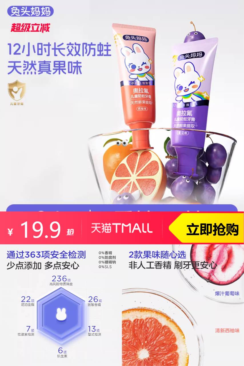兔头妈妈 兔头妈妈奥拉氟儿童牙膏50g*2 59元减10 商品纠错