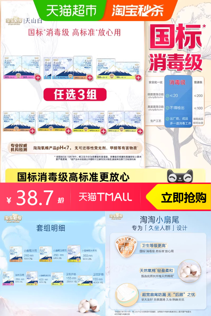 推荐:任选3组 淘淘氧棉天山白消毒级卫生巾