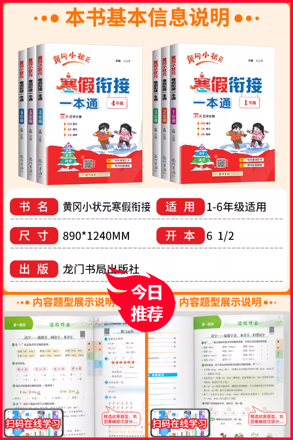 黄冈小状元,知识桥梁,启迪思维。寒假不荒废,一通全掌握。亮点独特,引领学习新风尚。黄冈小状元寒假衔接一本通!紧扣课标设计,语文/数学/英语全覆盖,复习+预习+打卡一体化,轻松赢在开学起跑线~
