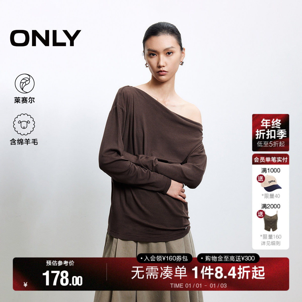 您的位置: 选单 > 女装 > ONLY莱赛尔羊毛斜肩长袖T恤