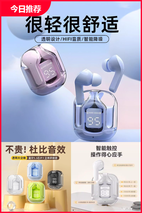 透明美学秀出真我,AAC+SBC高清解码,小巧时尚,智能触控,高清通话,持久续航,主从切换,佩戴舒适,电量显示,运动防汗。莫兰迪色系耳畔上的小时尚。