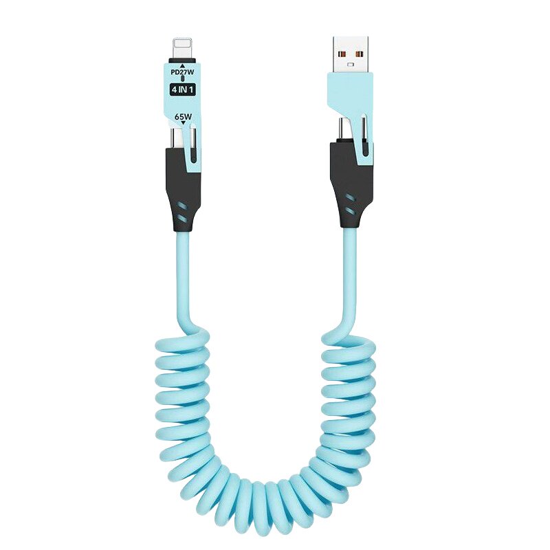 四合一弹簧数据线,手机/笔记本/车载自由伸缩,方便收纳,出差旅行一条就够。创意弹簧设计自由伸缩不缠绕。车载Carplay充电传输两不耽误。