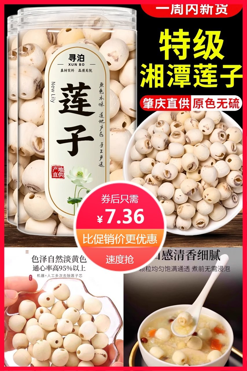 下拉详情进入大额补贴到手约5.7元,精选当季莲子,色泽自然,气味清香,磨皮去芯,不苦更香甜,适用于煮粥,煲汤等各种场景