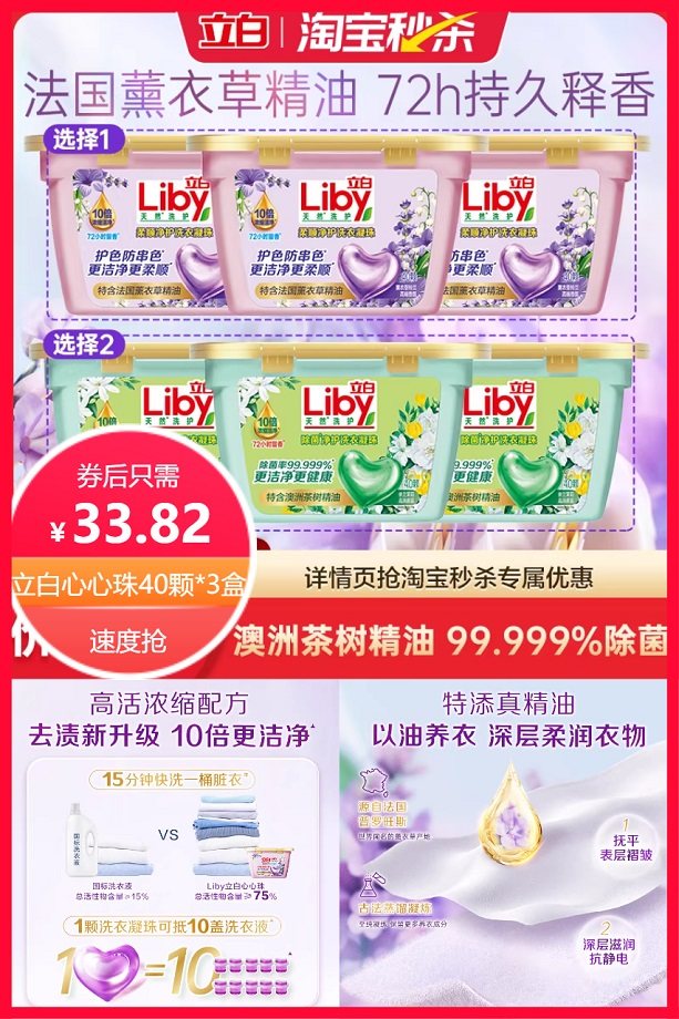 下拉详情淘金币省2.58元+88vip省1.82元后约32元,单颗只需0.26元,立白除菌净护凝珠+香氛净护洗衣凝珠薰衣草任选,除菌,抑菌,洁净,三效合一!1颗搞定浓缩配方!去渍去污方便,高效洗衣,解决衣物清洁难题,全家衣物够量洗!