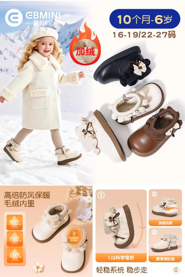 英贝米尼宝宝鞋专为学步期设计!加绒保暖+防滑软底+公主风造型,舒适不磨脚,萌趣又安全~172.9元到手!高端婴童品牌品质,冬季室内暖足首选,性价比远超同级!让宝贝迈出自信步的温暖小靴子,就在眼前!