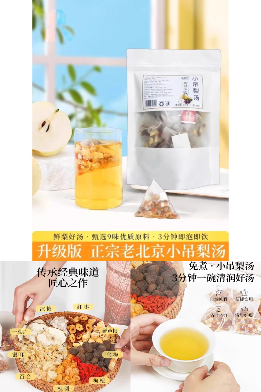 古法配方免煮小吊梨汤!雪梨+银耳+枸杞+罗汉果,0添加防腐剂,温润清甜暖秋冬~9.9元到手110克!一包一冲3分钟即享老北京同款润燥甜汤,把京味养生装进茶包里!