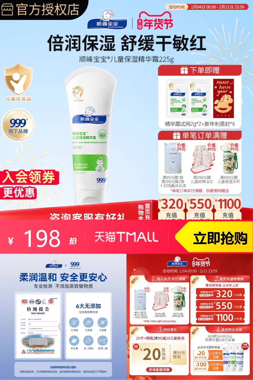 推荐:顺峰宝宝儿童保湿精华霜225g新生婴幼儿