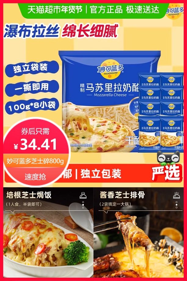 淘礼金4.49元+秒杀立减20.1元+券5元+88vip省2.25元+点击有上角三个点进入淘金币抵扣6元后约32.16元,喵满分×妙可蓝多,精制马苏里拉奶酪,烘焙原料芝士碎,800g,内含8袋独立包装,定量取用,一次一袋刚刚好,奶香浓郁,轻松拉丝!