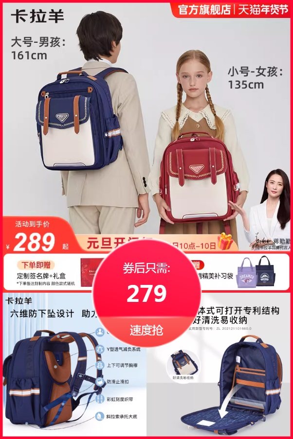 六维防下坠设计,助力挺拔身姿!卡拉羊一体式可打开专利结构好清洗易收纳~大容量,轻松容纳上学物件,年货节活动价,趁活动可以入哦~