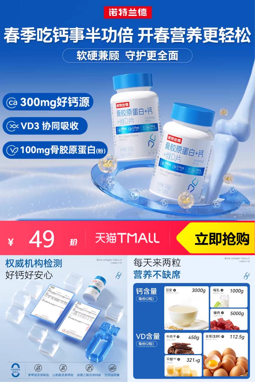【88VIP 2.45 淘金币9.99,到手价36.56】诺特兰德骨胶原蛋白钙+维d成人钙咀嚼片,身体有劲儿!呵护骨骼,只需咀嚼一下。骨骼强壮,有钙更有力!
