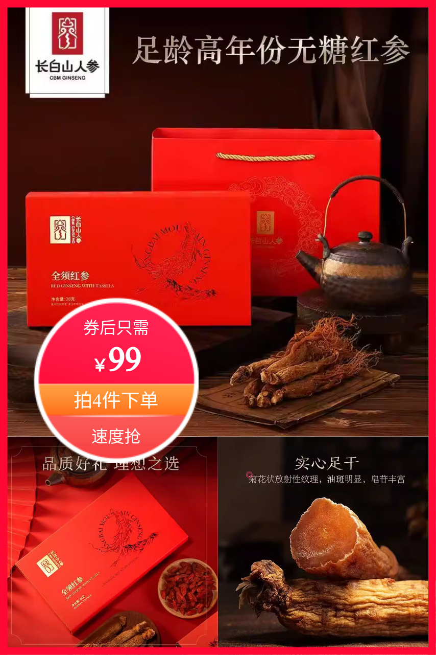 ⭕长白山人参!全须参晒参高档礼盒4盒配礼袋