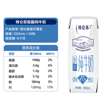 【百亿补贴】蒙牛特仑苏低脂营养纯牛奶250ml×16盒环保礼盒高端