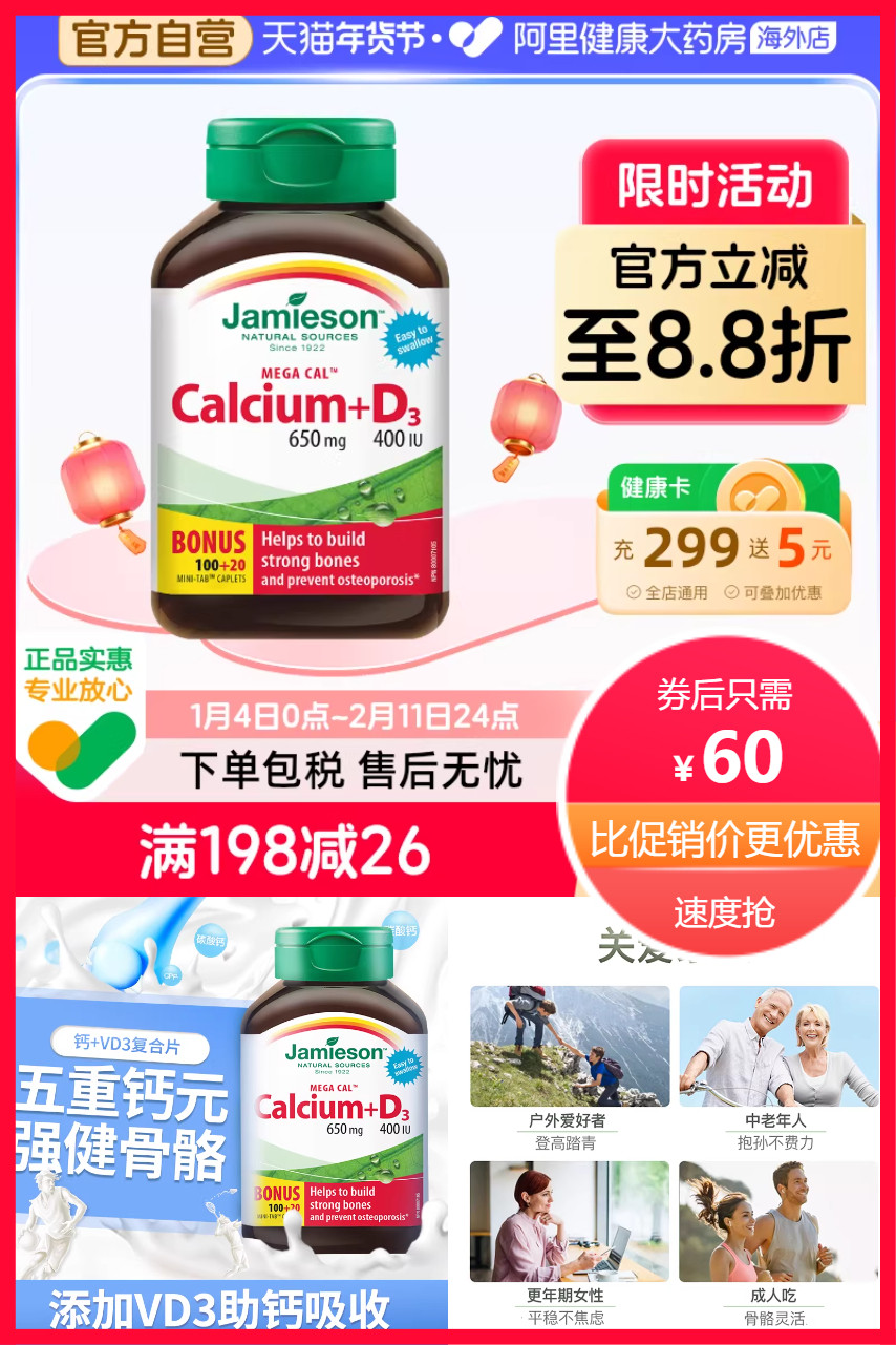 【VIP+首单+淘金币到手50.03】碳酸钙 + 柠檬酸钙,强化骨骼!维生素D3,促进吸收!孕妇成人适用!加拿大进口,官方自营保障!年货节满减,限时抢购!