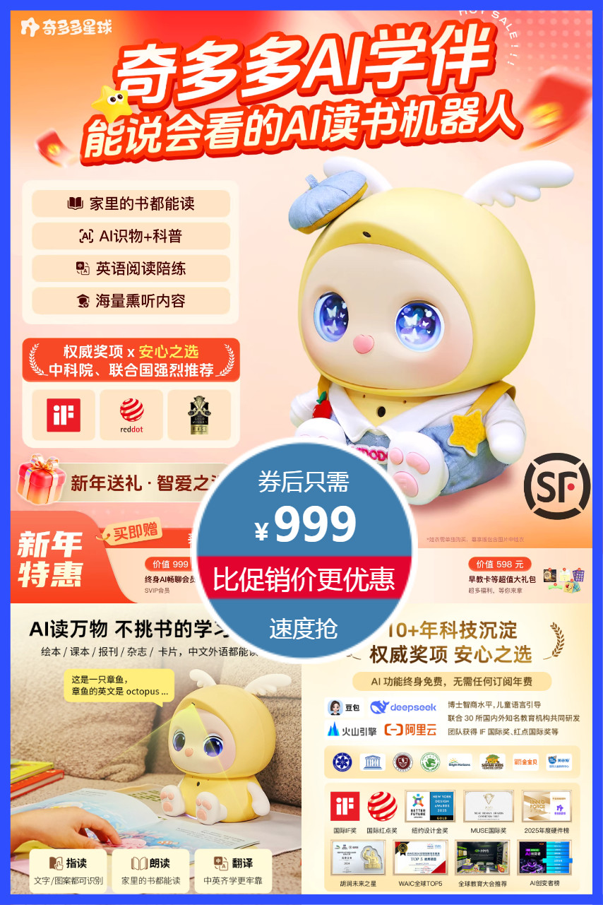 送30本双语绘本+早教卡一套+熊猫娃衣+阅读毯+贴纸+蝴蝶结镜头盖+喂食卡+眼罩!立减152元+淘金币+福利包叠加劵到手973.61元!奇多多儿童智能玩具AI学伴机器人,能说会看的AI读书机器人,能读书,能英语陪练,获得多项国际大奖,新年送礼!