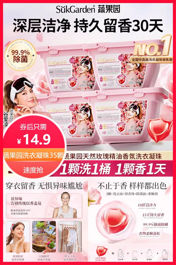 券15元+淘金币抵扣0.89元后约14.01元,蔬果园玫瑰洗衣凝珠,天然玫瑰精油,持久留香15天,除菌除螨,10倍洁净力,衣物柔软蓬松!