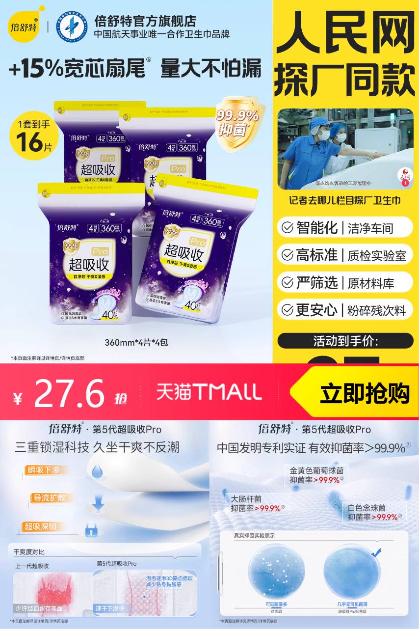 【百补价格27.6 叠加淘金币2.4 到手25.2 .】倍舒特夜用,舒适无痕,质量升级,加长360更放心,独特设计!抑菌保护您的健康。