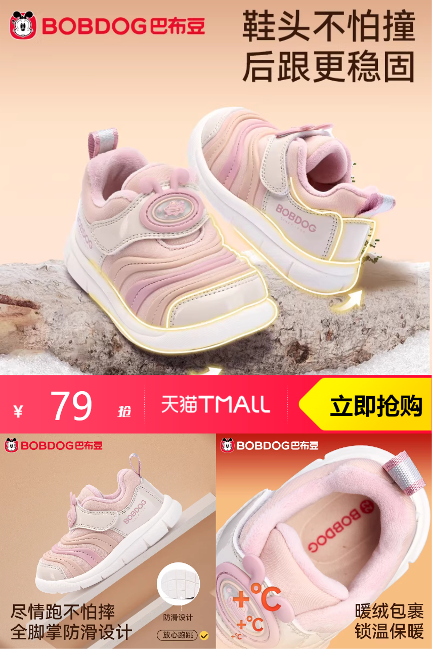【淘金币抵扣3元,弹店铺限时红包2元,凑消费券200-25,到手64.5元。】,巴布豆童鞋女童运动鞋冬季加绒防滑毛毛虫宝宝鞋子儿童学步机能鞋