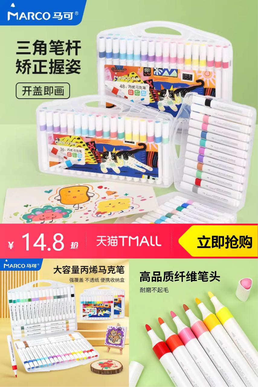 【淘金币减0.4,到手14.4】马可丙烯马克笔小学生美术专用水彩笔24色,强覆盖可叠色不透纸。