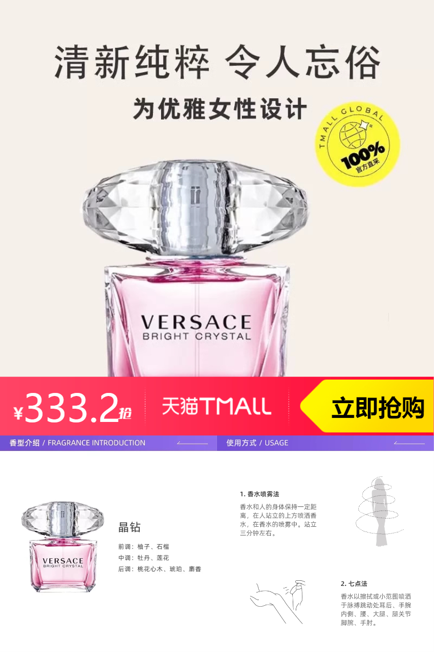 范思哲晶钻女士淡香水90mL,明亮芬芬、闪耀光芒,晶钻香氛,清新迷人,充满感性;粉钻香氛,温柔魅惑,浓郁诱人;迷人艳丽的香氛献给那些强势而自信娇媚且性感的女性。