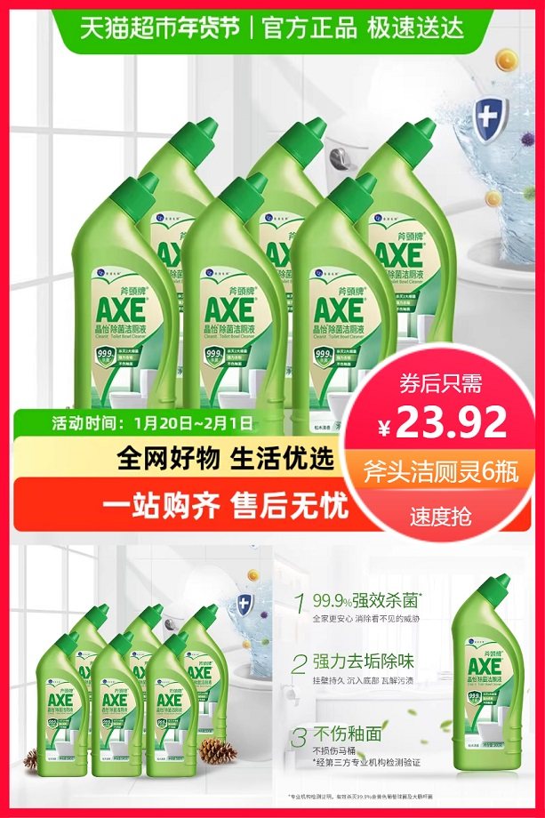 【官方立减15元+超市补贴2元+券6元+88vip省1.35元+点击右上角三个点进入淘金币抵扣2.98元后22.57元,单瓶只需4.7元】AXE斧头牌清洁剂500g*6瓶,双重清洁,强力去垢,除菌率高达99.9.%!权威机构认证,成立至今半个世纪的龙头企业,认准斧头牌!